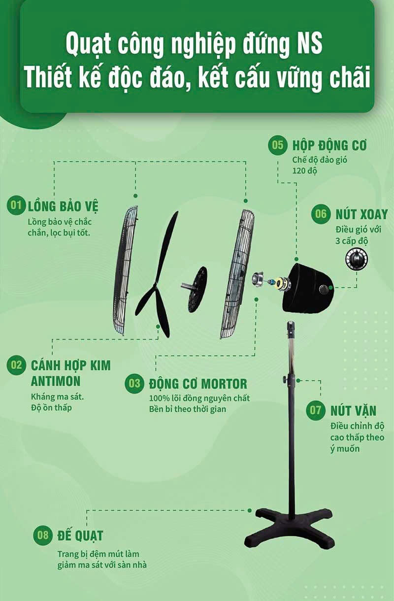 - Motor phù hợp giúp quạt công nghiệp lên gió nhanh, ít sụt tốc, giảm rung và giảm ồn tổng thể.