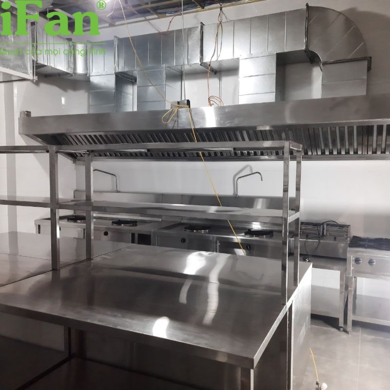- Bếp suất ăn công nghiệp 200–500 suất/giờ: ưu tiên hệ chụp hút theo line, quạt ly tâm áp suất phù hợp để kéo khói ổn định.