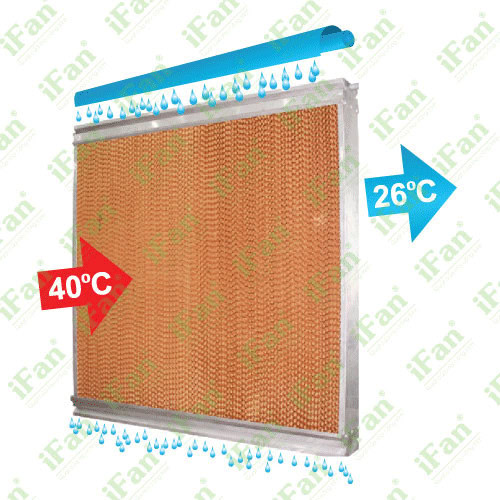 Khi hệ thống vận hành, nước được bơm tuần hoàn và thấm đều lên toàn bộ bề mặt tấm Cooling Pad, tạo nên lớp màng nước liên tục. Luồng không khí nóng từ bên ngoài đi qua cấu trúc tổ ong của tấm làm mát, tiếp xúc với lớp nước này và xảy ra quá trình bay hơi.