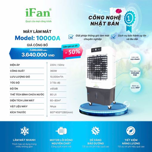 Quạt điều hòa iFan 10000A nằm trong phân khúc quạt điều hòa hơi nước cao cấp là một trong những dòng sản phẩm nổi bật trong lĩnh vực làm mát không khí, được thiết kế đặc biệt cho những không gian rộng như nhà xưởng, nhà hàng, hội trường, và các khu vực công nghiệp. Không chỉ làm mát nhanh chóng bằng hơi nước và 2 hộp đá khô đi kèm, máy còn sở hữu hình dáng sang trọng hiện đại với bề mặt tráng gương tinh tế. Việc trang bị bộ điều khiển bằng nút vặn cơ học, giúp cho iFan 10000A trở nên bền bỉ hơn với thời gian.