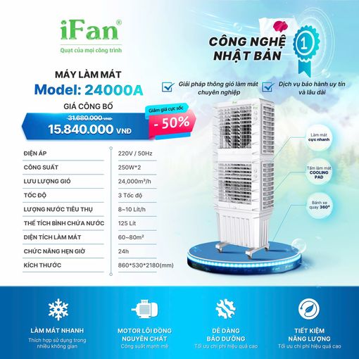 Quạt hơi nước iFan 24000A đến từ iFan Group có khả năng làm mát những khoảng không rộng từ 80-160m² như quán ăn, quán cafe, khu vui chơi, sảnh chờ, nhà hàng, nhà xưởng…